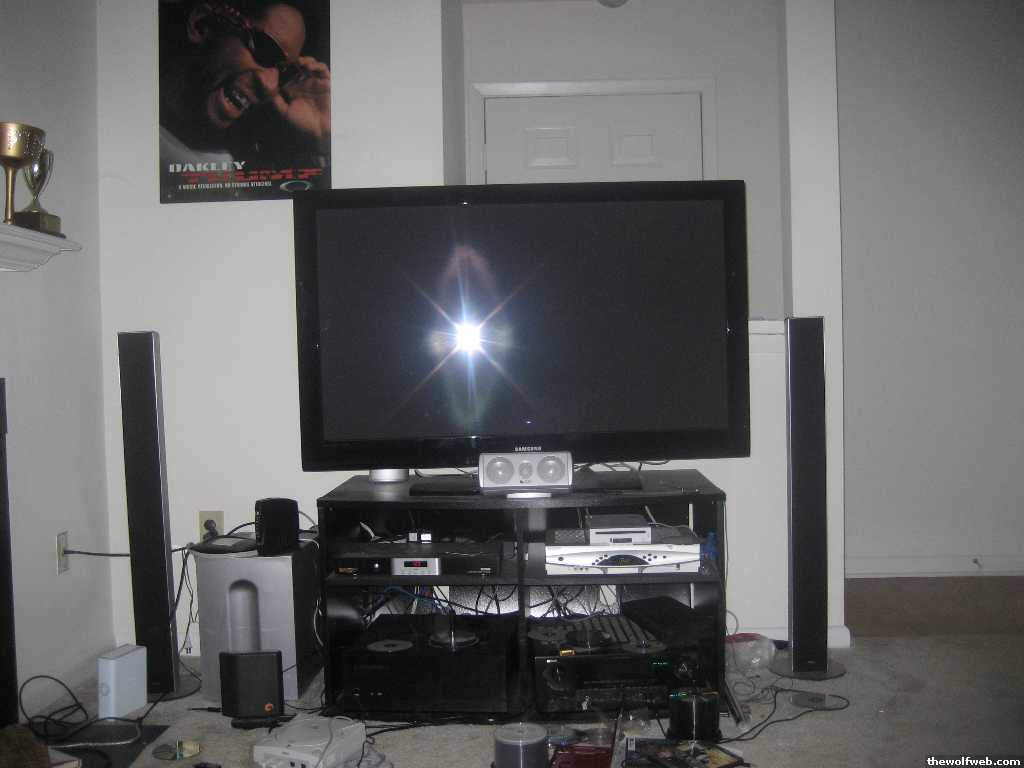 it's kinda tough to do your ht right when you live in an apt but my setup is as followssamsung pn50a550denavr987infinity tss-750 5.1 bundleathena technologies wss100 replacing the front L &R speakers of the infinity setrunning off my htpc w.BR and hdvd (soon to be replaced by a ps3 and standalone hd dvd player)monster hts 1600 surge protector(no i didn't pay retail)Dreamcasti want to get rid of the infinity set but they perform incredibly well for their size and with me sharing walls all around i don't want the catch the attention of Raleigh's finest. and now looking back at the pic cable ties may not be a bad investment.