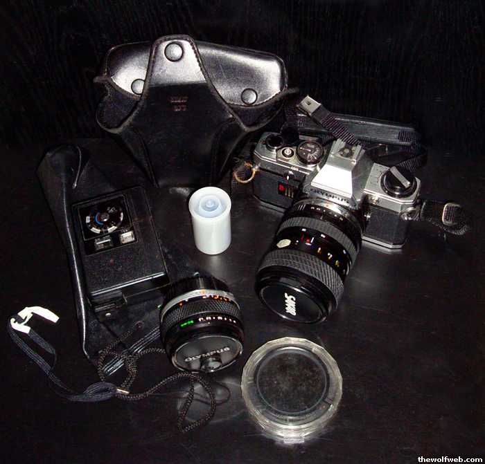 3 pm's... the camera comes with a 50mm f/1.8 lens, a 70mm sakar macro lens, a polarizer, an argus 9138 flash, and a roll of film.