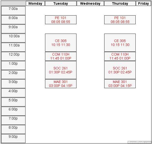 thats similar to how mine was the semester i got deans list...once i got past wed i knew thurs and friday were easy and i had the weekend after that...perfect way to make a schedule imo