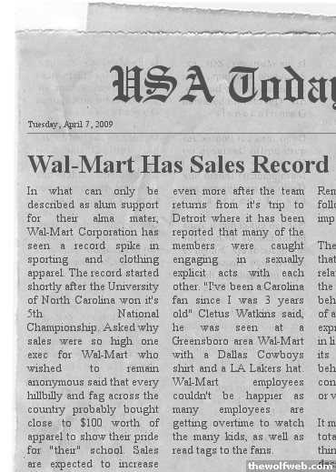 Haha, I was with my girlfriend in Athens, GA on saturday, and we went in to wal-mart... Naturally, there was a ton of UGA stuff there, and I commented that there's probably a bunch of UNC stuff in the joint, too. She absolutely refused to believe there would be a bunch of UNC stuff there.So, even though I had never been in the store before, I walked in to men's section, straight to the sports area, and promptly pointed out five different types of UNC hats and shirts to her. She then shut up. lol]