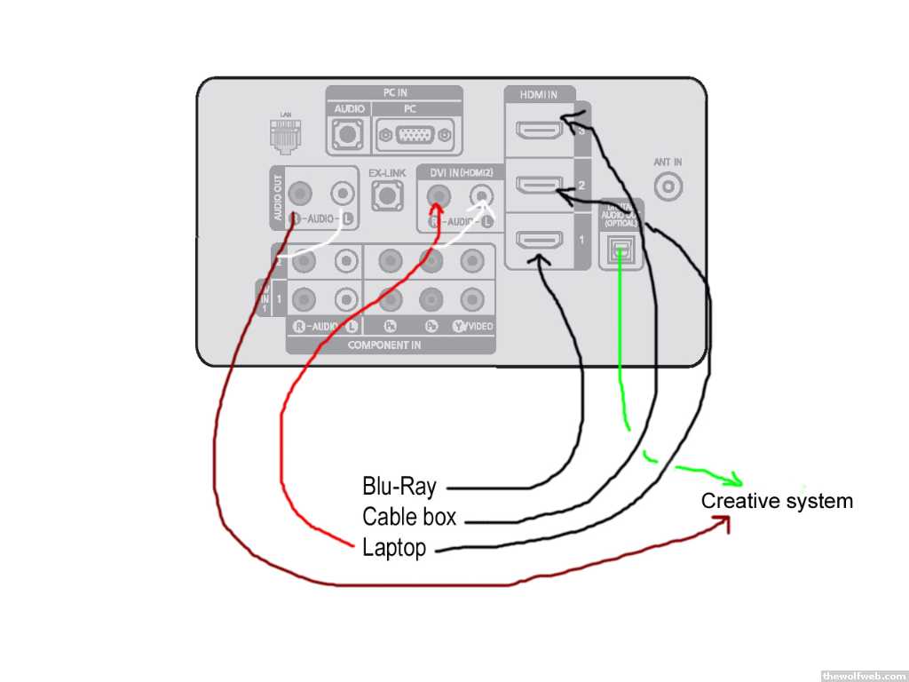 Even simpler than ^*this is assuming your Creative sound system can take an optical (tos-link) input*green: tos-link (6' for $2.14)http://tinyurl.com/2cynkvlaptop dvi-to-hdmi cable (15' for $6.69)http://tinyurl.com/2wnbvdthe "optical out" on the tv may not output the analog sound from your laptop cable, in which case you can keep the red/white cable connected straight to your Creative system. For a more permanent solution, hook it up as shown in the drawing. You'll now need the burgundy wire (which will be the same type as the red/white adapter you already have):stereo plug to RCA adapter wire (6' for $0.63)http://tinyurl.com/2dxeqaFor some extra slack in the analog wires:stereo plug extension wire (12' for $0.85)http://tinyurl.com/b37276If you can switch between digital and analog inputs on your Creative system, then you've got it made. If not, then you'll have to do the swapping bit, but at least you'll be messing with the sound system instead of being crammed behind the TV messing with wires.Make sure you specify analog sound for your HDMI 2 connection.[Edited on April 29, 2009 at 9:42 AM. Reason : ]