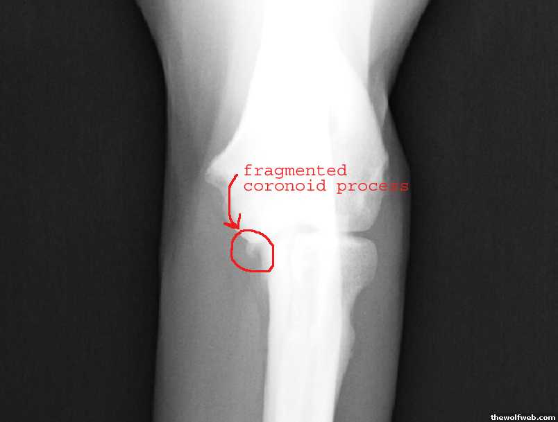 it's not UAP, it's fragmented coronoid process. still hereditary and basically the same situation in terms of needed surgery and whatnot. both of her elbows are affected, the left being slightly worse.here are her xrays...the fragmented piece, circled. the typical arthritis caused by this broken piece it was really awesome to get the scans on a disc and to get the software to view them (although it had no print function so i did printscreen into photoshop). he didn't charge me for her pain killer injection, did a full blood workup for free, heartworm/lyme disease test for free, and xrayed both hips for free!!!!! we had suspected a problem with them in the past but they were fine. i had always wanted to get them xrayed but it was just never absolutely neccessary. yay dr. coats!!!![Edited on July 16, 2009 at 3:01 PM. Reason : ]