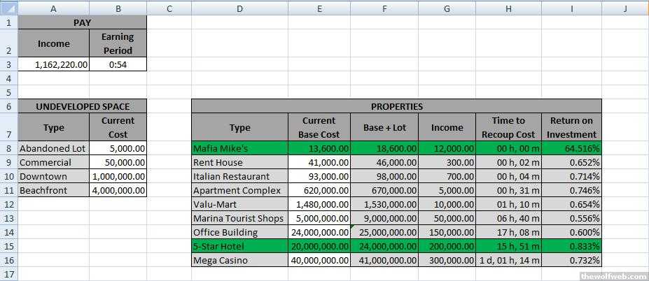 I'm trying to max out New York before going to Cuba. I did make an excel sheet, but I stopped using it because I achieved my goal of getting and selling 50 Mega Casinos. There's really no point to the money now anyway, since all the random loot is much better than what you can buy. Maybe if they made the special weapons you can buy be like, 10 trillion dollars each