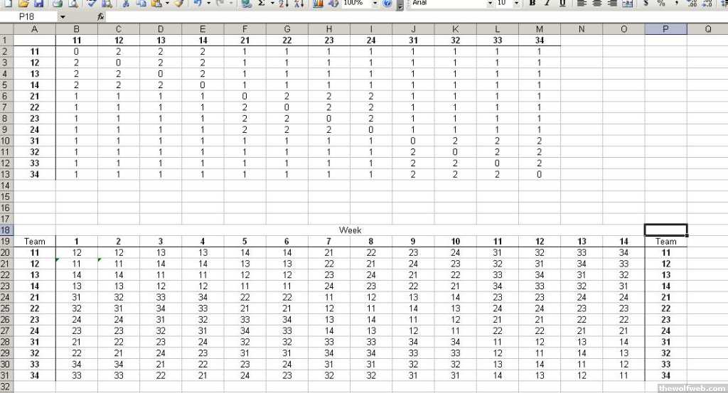 The lower table is the schedule. I filled in the top row manually and filled the remaining cells with VLOOKUP($A21,B$20:$P20,16-B$19,FALSE). When you enter one game (e.g. 11 vs. 12) the formula fills in the cell for the other team (12 vs. 11).