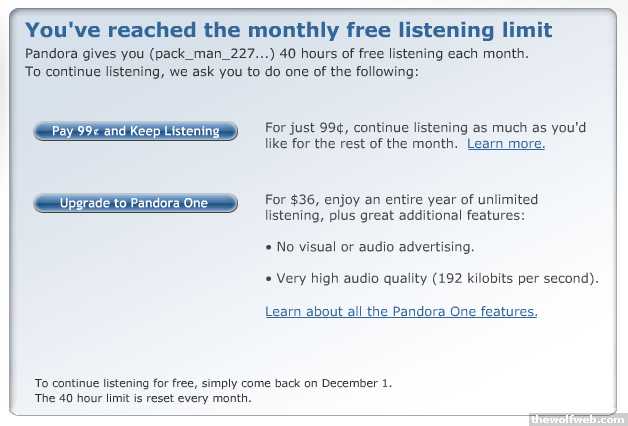 On July 7, 2009, Pandora announced that an agreement had been reached regarding the royalty issue, which would significantly reduce the royalty rate, making it possible for Pandora to stay in business. Also announced was that free listening would be limited to 40 hours per month, but can be extended to unlimited for that month for USD$0.99. "The revised royalties are quite high," the company's blog notes, "higher in fact than any other form of radio".[10] The extended listening fee differs from "upgrading", which also disables advertisements, increases the bitrate to 192 kbps, and provides a dedicated music player (as opposed to listening through browser). This service, known as "Pandora One", costs $36 and is billed annually.[11]"