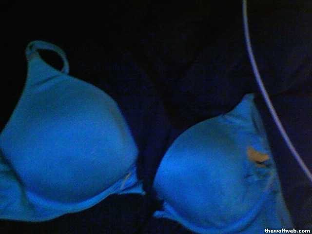 last night at 4 something i woke up (LUCKILY) to pee to find that my laundry that was on my other bed had been moved to the floor. my dog was surrounded by it and looking at me like "whaaaa did i do"and my teal bra was in pieces on the floor (i'm pretty sure she ate some of it, too)then this morning i tried to put on some socks and the bottom of the sock was chewed out. so then i tried to put on another pair of socks and the bottom of one of the socks was chewed out on that pair too!!shitty computer pics but....the culprit:the damaged goods:(we already knew i had small boobs so don't make fun, k thanks)