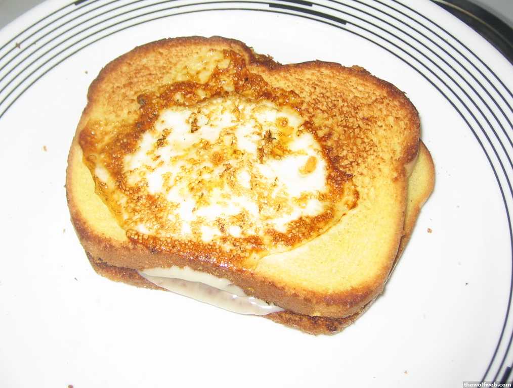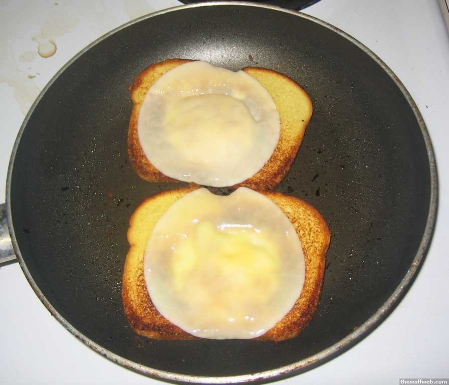 eggs in potato bread: flipped over: with provolone cheese: sammich: