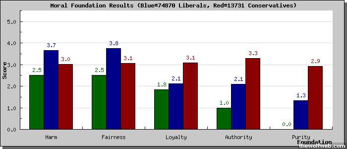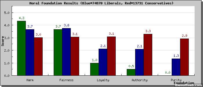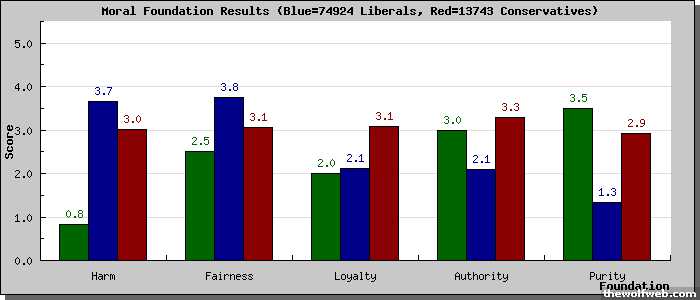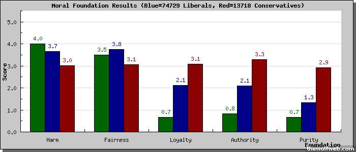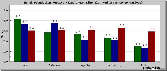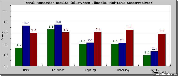 [image]http://www.yourmorals.org/surveyresults_graph_libcon.php?u=1003957&tbl=5f_new2&type=&scale=5&match=&rev=&title=Moral Foundation Results&ytitle=Score&xtitle=Foundation&labels[]=Harm&labels[]=Fairness&labels[]=Loyalty&labels[]=Authority&labels[]=Purity&&vars[0][]=5f_part1_2&vars[0][]=5f_part1_3&vars[0][]=5f_part1_4&vars[0][]=5f_part2_2&vars[0][]=5f_part2_3&vars[0][]=5f_part2_4&vars[1][]=5f_part1_5&vars[1][]=5f_part1_6&vars[1][]=5f_part1_7&vars[1][]=5f_part2_5&vars[1][]=5f_part2_6&vars[1][]=5f_part2_7&vars[2][]=5f_part1_8&vars[2][]=5f_part1_9&vars[2][]=5f_part1_10&vars[2][]=5f_part2_8&vars[2][]=5f_part2_9&vars[2][]=5f_part2_10&vars[3][]=5f_part1_11&vars[3][]=5f_part1_12&vars[3][]=5f_part1_13&vars[3][]=5f_part2_11&vars[3][]=5f_part2_12&vars[3][]=5f_part2_13&vars[4][]=5f_part1_14&vars[4][]=5f_part1_15&vars[4][]=5f_part1_16&vars[4][]=5f_part2_14&vars[4][]=5f_part2_15&vars[4][]=5f_part2_16&[/image]