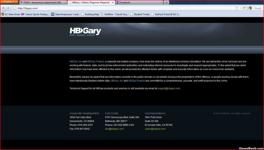 holy shithttp://www.guardian.co.uk/technology/2011/feb/07/anonymous-attacks-us-security-company-hbgaryThe loose hacker collective Anonymous says it has taken revenge on a US security company whose principal claimed to have penetrated the group and identified some of its key people.They hacked the Twitter account of Aaron Barr, the chief executive of HBGary, and sent out a series of angry tweets while many Americans were watching the Super Bowl match on Sunday night, allegedly including Barr's social security number and address, and his mobile phone number.The tweets link to torrents of the company's emails. Members of the group also put up a brutal set of claims: "Anonymous has:"entire control of all emails for the company of hbgary.com. we have full admin control of"hbgaryfederal.com. we have wordpress control of hbgary.com"all emails will be put up in a torrent."full access to all their finincials"their ssns [social security numbers]"their w2s [US tax reporting statement]"their 1099s [US tax identification certificate]"their software products"their malware data (although Anonymous rm'd [deleted] their entire terabyte of data sorry)"their backup server was wiped."access to their pbx system via 8x8.com"control of their support server and their clients logins"root access to rootkit.com, personal website of greg hoglund"aaron barr's ipad is now wiped"Barr could not be contacted to find out how many of these details were correct. The HBGary site had been replaced by a placeholder this morning.