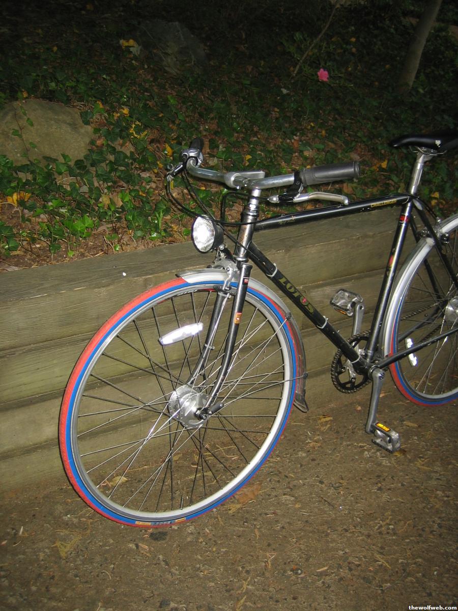 The Lotus' frame is a 56cm. The front hub is a chinese knockoff of Shimano's HB-NX30 dynamo hub, 6V 3W output, powering a New Anlun light. The rear has a Shimano Nexus 7-speed internally geared hub. Both wheels are laced to Alexrims 1019s. It has Nashbar brakes, a Fuji moustache handlebar and no-name fenders. There are currently Red with Blue sidewall Continental Grand Prix 3000 tires on the bike, but I will happily swap these out as mentioned. Pics are in photo gallery, I'll happily add moar if you'd like to see something particular.