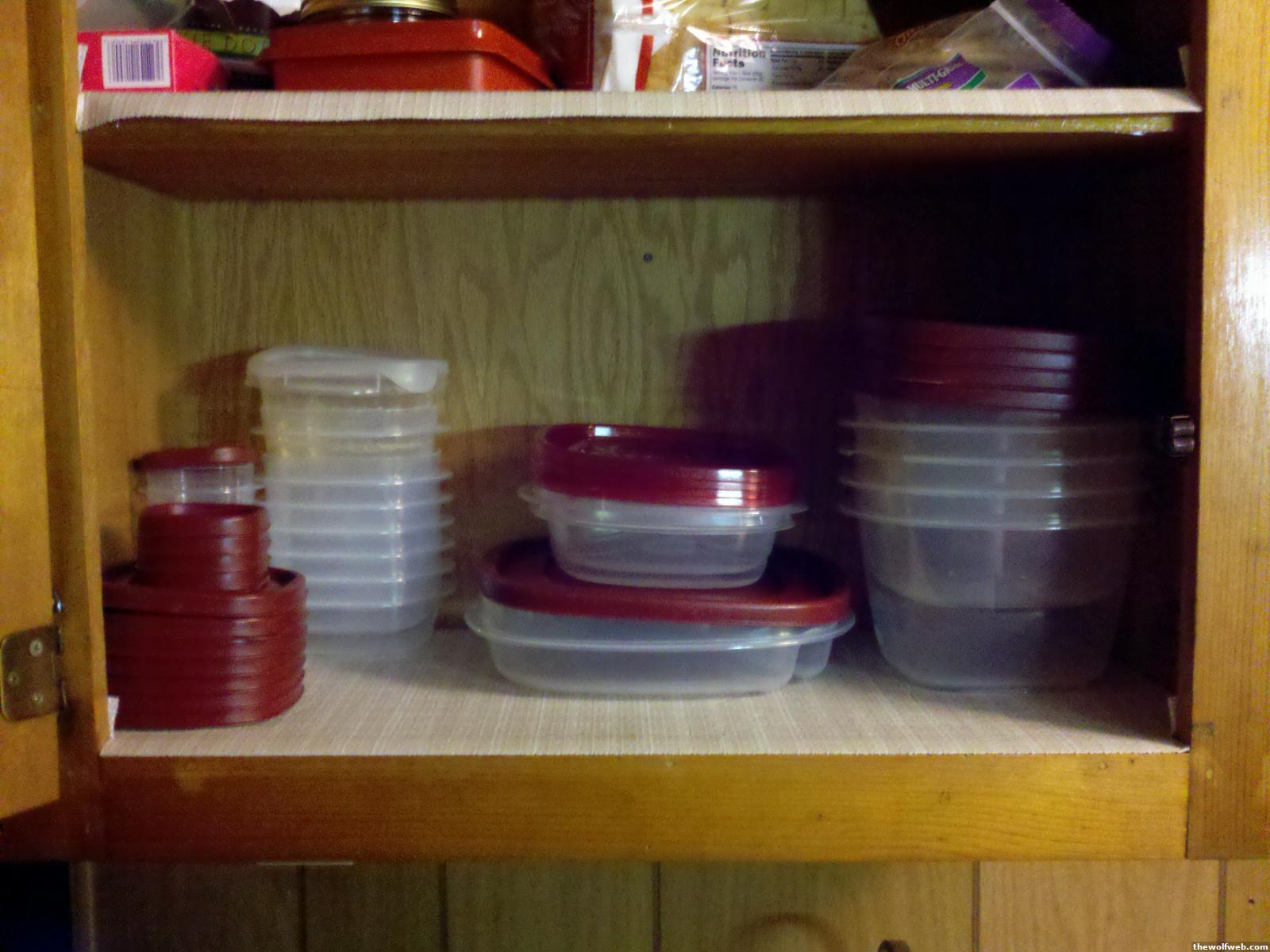 maybe the solution would be to buy a big set of them that are made to nest together well and share lidsthere are 17 in that cabinet now and a few more in the fridge with leftovers in them and they'd match right up with those in there.