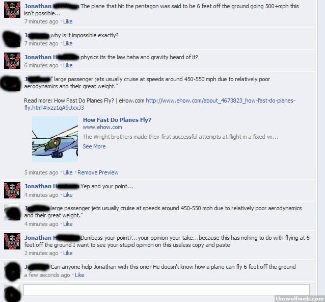 Jonathan Herdman Explain to me how an object weighing over 220,000 lbs moving at speeds in excess of 500 mph at the angle of entry with amateur pilots at best could pull off a maneuver expert pilots can not do was achieved32 minutes ago · LikeJonathan Herdman http://youtu.be/GNMakBEECqA24 minutes ago · LikeJ - They crashed20 minutes ago · LikeJonathan Herdman should have bounced off the ground...brilliant counter argument though hahaha18 minutes ago · LikeErnie - I don't think it's impossible but it would definitely require an incredibly skilled pilot... http://www.youtube.com/watch?v=UntN_cZUQg813 minutes ago · LikeJonathan Herdman WOW that was low fuuuuk...but doesn't really apply to this argument because it is a harrier the handling is miles apart from the 75710 minutes ago · LikeJ- It takes an incredibly skilled pilot to crash a plane?10 minutes ago · LikeJonathan Herdman ?^J your idiot is showing9 minutes ago · LikeJ riiiight.about a minute ago · Like
