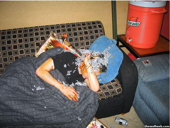 tar & feathered my roommate once with a friend after drinking. used condiments and pillow stuffing