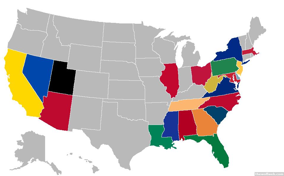NC, SC, VA, GA, TN, WV, MD, DE, NJ, PA, NY, CT, MA, VT, ME, KY, OH, IN, FL, MS, AL, LA, TX, NM, NV, WA, CA,